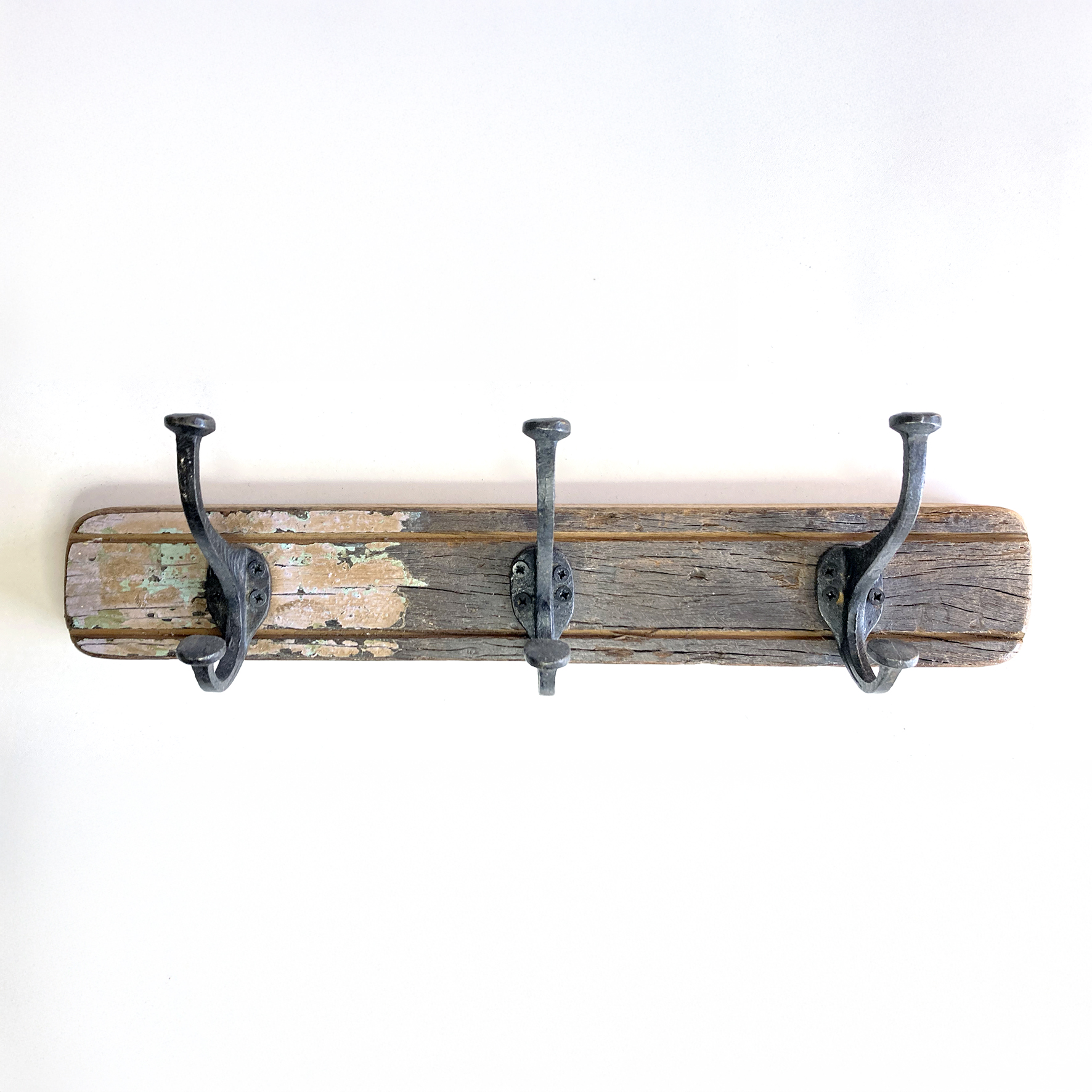 Deze kapstok met 3 dubbele haken is gemaakt van hergebruikt sloophout waar de originele verf nog op te zien is.